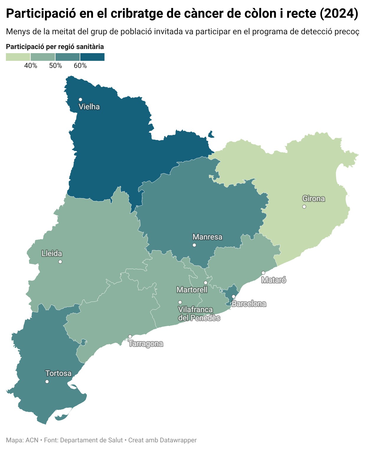 Per regions sanitàries, la participació oscil·la entre el 61% de l’Alt Pirineu i l’Aran i el 39% de Girona, segons dades del 2024. A la regió sanitària de la Catalunya Central, la participació és del 54%; a les Terres de l’Ebre, del 52%; a Barcelona Ciutat, del 51%; tant a la regió metropolitana nord com la sud de Barcelona, del 48%; a Lleida, també del 48% i al Penedès, del 44%.