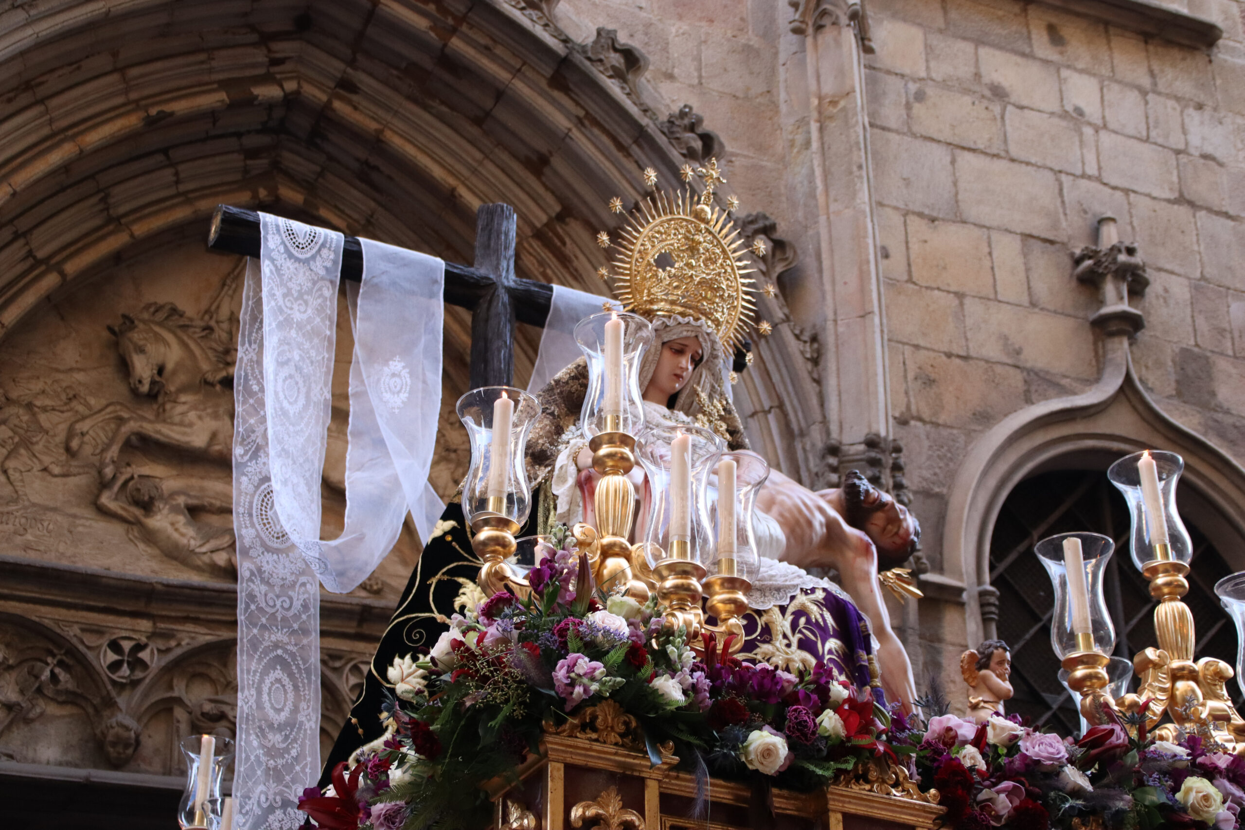 ACN Barcelona – La processó de Divendres Sant ha desfilat un any més pels carrers del districte de Ciutat Vella, a Barcelona, amb un pas solemne i amb el pas de Jesús carregant la creu i la Verge com a protagonistes. La imatge del Nostre Pare de Jesús del Gran Poder, de la Pontifícia i Maria Santíssima de l’Esperança Macarena ha tornat a sortir de la parròquia de Sant Agustí carregat a les espatlles dels portants. El seguici ha començat uns minuts passades les 17 h i acabarà cap a les 23 h al mateix punt on ha començat passant pel carrer Hospital, l’avinguda Catedral i la plaça del Pi, entre altres. Una mica més tard, cap a les 18 h, ha començat la processó de la Verge de les Angoixes, que ha sortit de la parròquia de Sant Jaume, al carrer Ferran.