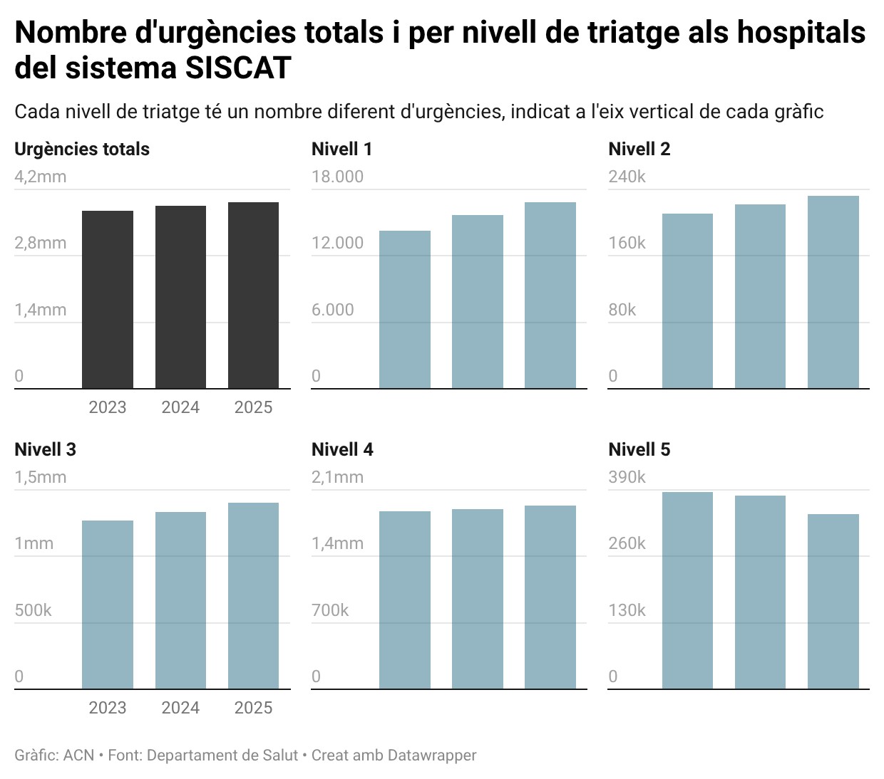 Ja al nivell 3, l’espera el 2025 va ser de 60,59 minuts, pels 58,49 minuts del 2024. L’any anterior, el 2023, el temps va ser de 65,99 minuts. Així mateix, l’espera el 2025 al nivell 4 era de 62,23 minuts, pels 60,29 minuts del 2024, i els 64,29 del 2023. Finalment, el temps del nivell 5 era de 49,59 minuts el 2025, 50,89 el 2024, i 52,63 minuts el 2023.