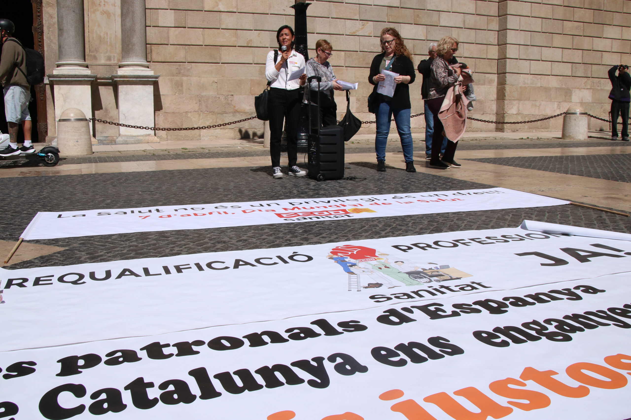 Després de l’acte de Marea Blanca, el sindicat CCOO ha convocat una concentració, també a plaça Sant Jaume, pel Dia mundial de la salut. Han desplegat diverses pancartes davant l’accés al Palau de la Generalitat amb lemes com ara ‘Per una sanitat pública i de qualitat’, ‘La salut és vida’, ‘Ara conveni sectorial de recerca’ i ‘Requalificació professionals ja!’. La convocatòria ha comptat amb la participació de la secretària general del sindicat, Belén López, que ha exigit acabar amb la instrucció de les baixes mèdiques.