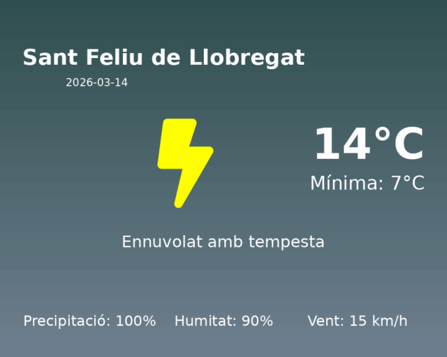 Avui, a Sant Feliu de Llobregat, ens espera un dia amb condicions meteorològiques especialment inestables. La temperatura màxima arribarà als 14 graus Celsius, mentre que la temperatura mínima rondarà els 7 graus Celsius.