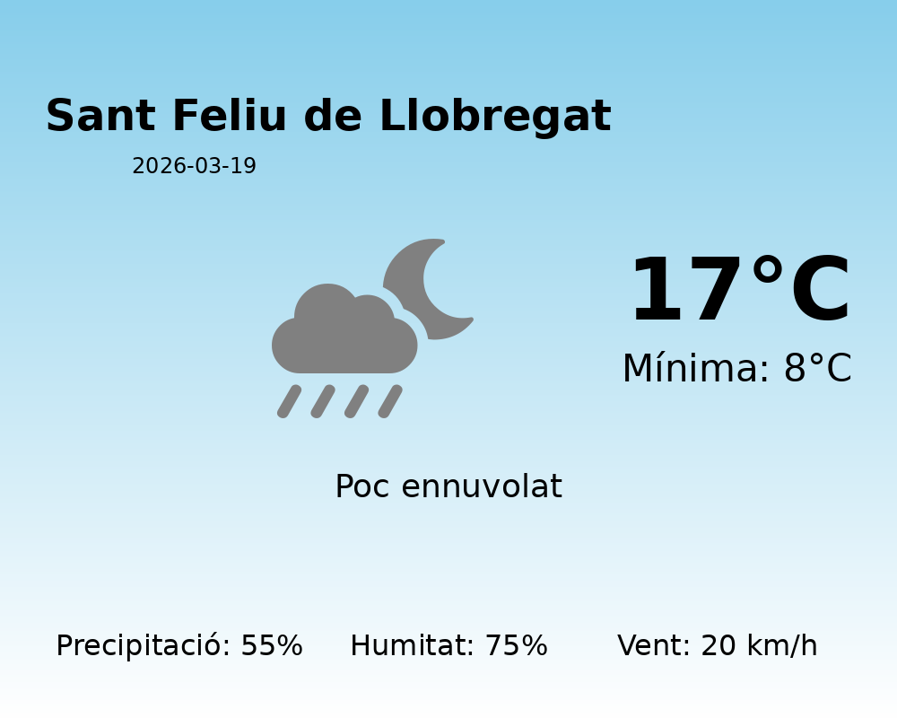El cel estarà parcialment cobert, amb un índex de nebulositat de 12, que indica la presència de núvols dispersos. A més, cal esperar plugims intermitents al llarg del dia, ja que es preveu una precipitació acumulada de 55 mm. És aconsellable portar un paraigua o roba impermeable si es preveu estar a l’aire lliure.