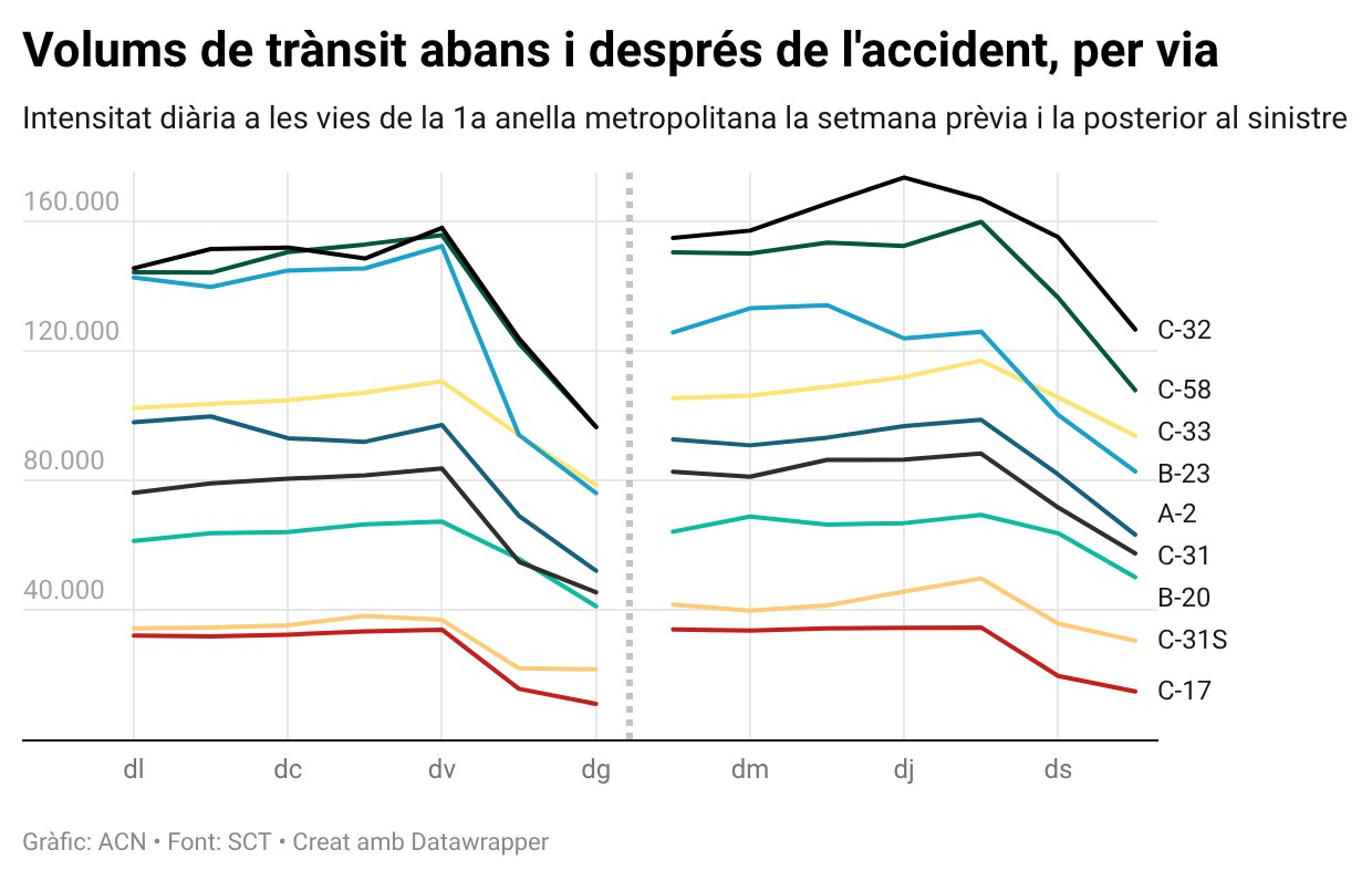 Tot i això, els increments no han estat uniformes i, de fet, a la B-23 (que connecta Barcelona amb l’AP7 al sud de la ciutat), es va produir una baixada del trànsit (entorn d’un 7,5%), probablement relacionada amb el tall parcial i total de l’AP7 en sentit sud a l’altura de l’accident de Gelida. Derivat també d’aquesta afectació, el tram sud de la C31 va incrementar com cap altra la intensitat diària de vehicles, amb fins a un 27% setmanal més. Pel que fa a la resta, destaca l’increment d’un 12,7% dels vehicles a la C-32, que passa per una part de la costa catalana, concretament pel Baix Penedès, el Garraf, el Baix Llobregat, el Barcelonès i el Maresme.
